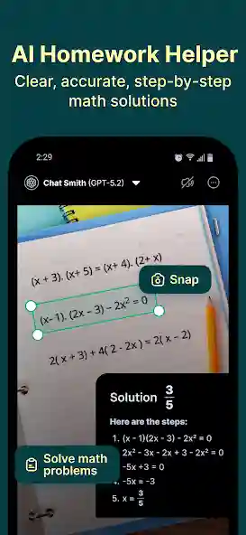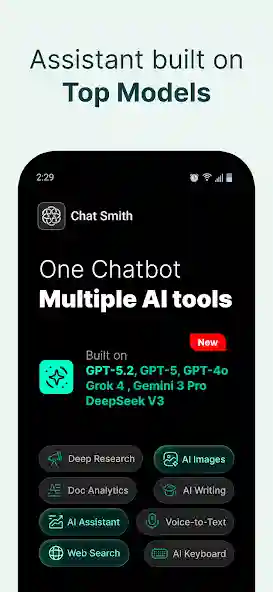 AI Chat Smith is an AI-powered chatbot and productivity assistant built for Android devices worldwide. It runs on advanced models like GPT-5, Gemini 3, Grok-4, and DeepSeek V3 under the hood. You simply type or speak your question and the app delivers a clear answer in seconds. It covers writing, research, coding, math, translation, and creative tasks in one clean interface. Smart Widget Labs developed this app and it now holds over five million downloads on Google Play.
