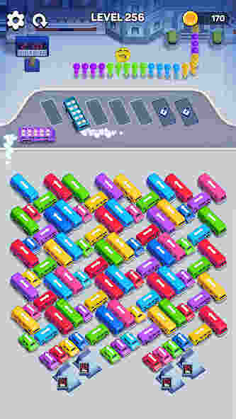 Your main goal is to get buses out of the lot. Identify which buses are blocking the main exit route and focus on moving them first. Once the exit is clear, the rest of the puzzle becomes much easier.