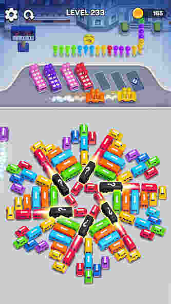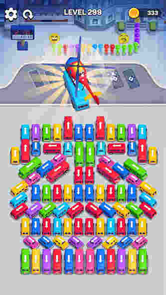 It is a logic puzzle game where your goal is to clear a traffic jam. Buses of different colors are parked in a gridlock. You have to tap on them to move them out of the lot. But there is a catch: passengers are waiting. You have to move the buses in a specific order so that the right passengers can get on the right bus. If a red bus is blocked by a blue bus, you have to move the blue one first. It requires planning and foresight to clear the whole lot efficiently.