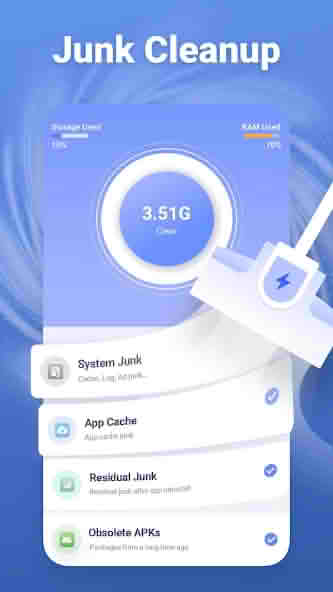 The original Clean Master app was made to find and remove junk from your Android phone. It looks at all the files on your phone. Finds old cache, leftover folders from games you deleted and duplicate photos. You press one button. It removes all that junk from your storage for good.