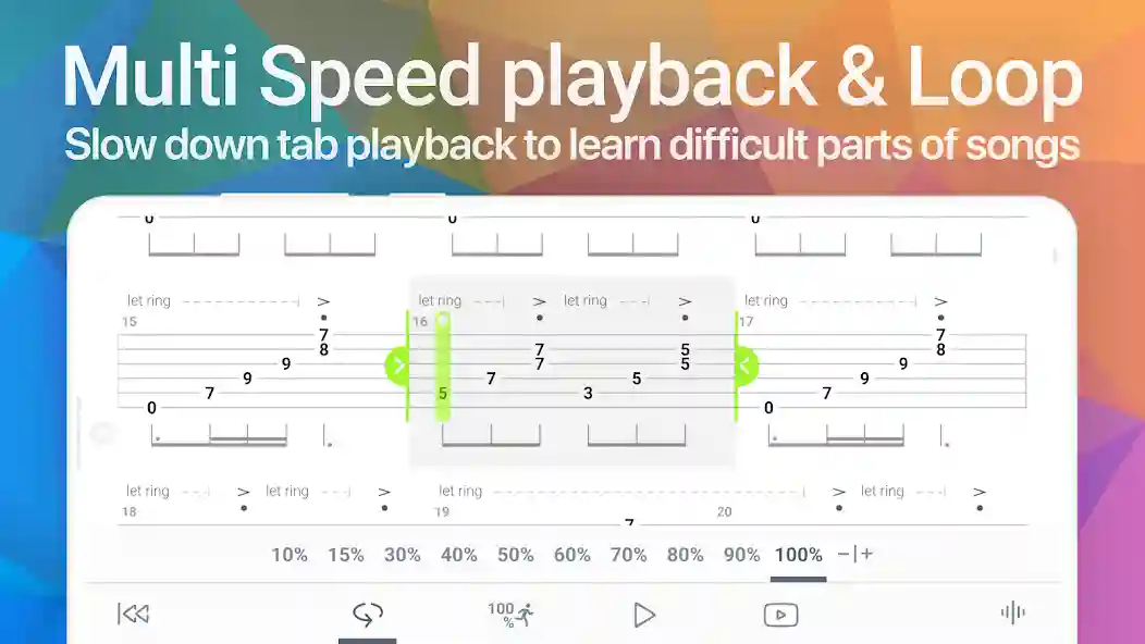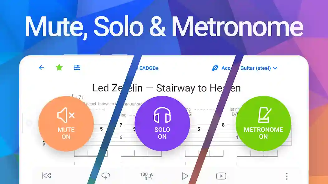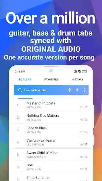 playing along to a basic synthesizer beep feels lifeless and boring. You want to feel the energy of an actual band playing behind you. This app syncs the written tabs with the real studio audio tracks. When you hit the play button you hear the song, with the genuine singer and drummer while the tab scrolls exactly in time. This feature vastly improves your sense of rhythm and musicality. You feel like a real band member standing inside the recording studio.