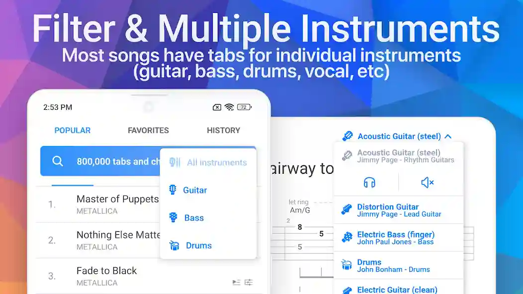 Most people think tab websites only cater to guitar players but a real band has moving parts. This app covers every popular instrument. If you want to learn drum fills they have them. If you want to practice bass lines or keyboard melodies you will find those too. It gives you a picture of how the entire song comes together. You can easily switch between reading the guitar part and the rhythm acoustic section with just one quick screen tap.