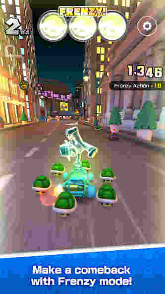 It is the mobile version of the classic racing game we all love. The karts drive themselves, so you just focus on steering and using items. Drifting is really important; if you hold a turn, you get a speed boost. The tracks are full of ramps and bad guys like Goombas. You need to learn the tracks well to stay fast and win races. In this game, points are just as important as finishing first. You get points for doing cool stuff like hitting other drivers, collecting coins, and doing jumps. If you do these things one after another, your score goes way up. The best feeling is “Frenzy Mode.” This happens when you get three of the same item. For a short time, you are invincible and can use that item as much as you want.