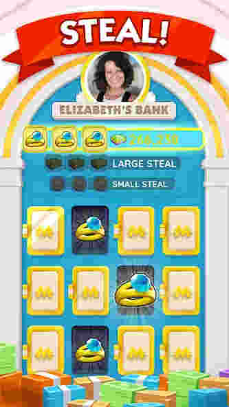 Landing on a Railroad tile is arguably the most exciting moment in the game because it often triggers a Bank Heist. This mini-game transports you to another player’s vault-often a friend’s. You are presented with a grid of safe doors. Behind them are symbols for Small, Large, and Bankrupt heists. Your goal is to match three identical symbols. If you are lucky enough to match three gold rings (the Bankrupt symbol), you steal a massive chunk of that player’s cash. It’s a thrilling moment of “risk vs. reward” that connects you directly to other players’ economies.