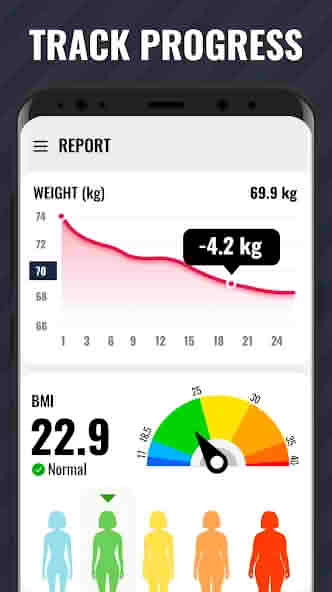 Lose Weight App for Women Mod Apk keeps track of your daily calorie burn, exercise time, weight changes. As a result, you will be able to understand your progress every day.