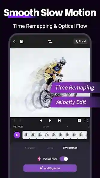 Motion Ninja includes tools like chroma key and green screen, plus advanced transitions and 3D effects that can give a cinematic feel. The app also mentions smooth slow motion using optical flow interpolation, which helps motion look fluid during speed changes. Basically, if you want a cinematic video editing app for fan edits or music video style cuts, you can mix keyframes, effects, and transitions.